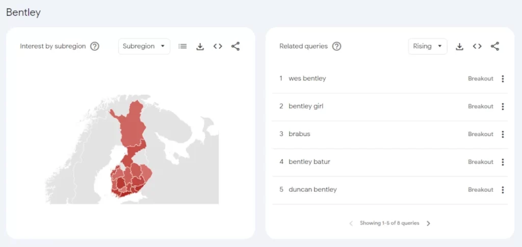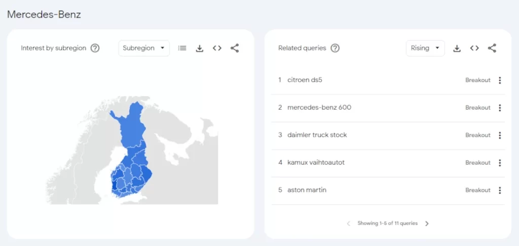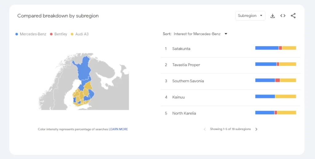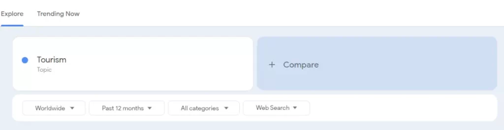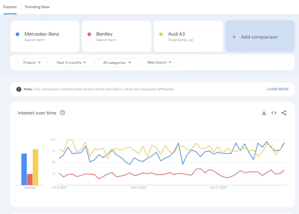 We can also compare trends for two search terms. This enables us to conduct a comparative analysis. The topic could be about products, services, and competition between competitors.