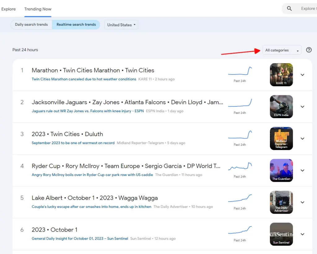 Another option is to find trends in real time. By using that, you can find trends in a particular topic. We have the option to either find all trending topics by default or select a specific category.